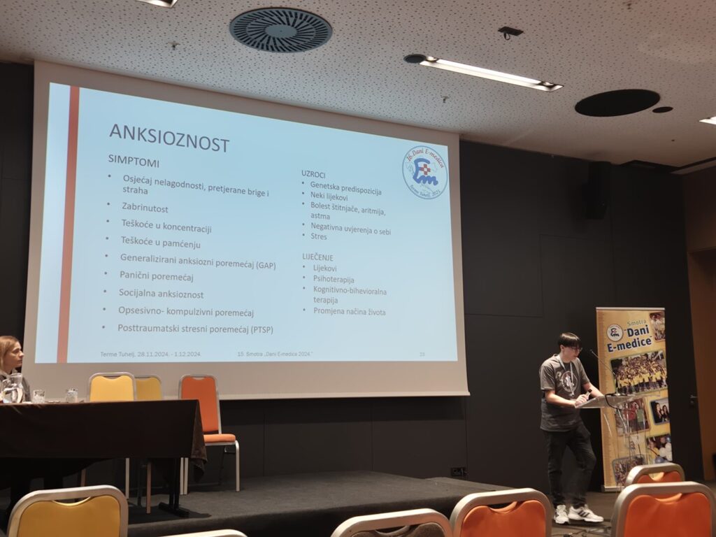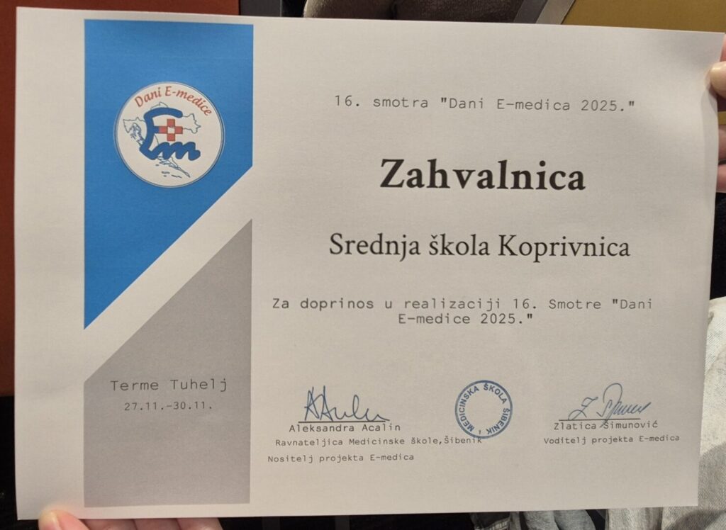 Od 28. do 30. 11. učenici 4. i razreda Sandra Tot i Gabriel Dolama te učenik 4. l razreda Mateo Šimun predstavili su suradnički projekt “Kronične bolesti srednjoškolaca-tajne hodnika” na 16. smotri Dani E-medica u Tuhelju. Učenici su godinu dana radili na projektu sa školama zdravstvenih usmjerenja te proveli anketu o kroničnim bolestima srednjoškolaca kako bi ukazali na važnost edukacije učenika i nastavnika o istima. Svoje rezultate i zaključke prezentirali su na smotri na kojoj su imali priliku slušati zanimljiva predavanja svojih kolega i kolegica koja su obuhvaćala zanimljive zdravstvene teme. Svaku večer organizirani su pub kvizovi gdje smo se opustili i zabavili, a u slobodno vrijeme mogli smo se kupati na bazenima ili šetati po šumama Zagorja.