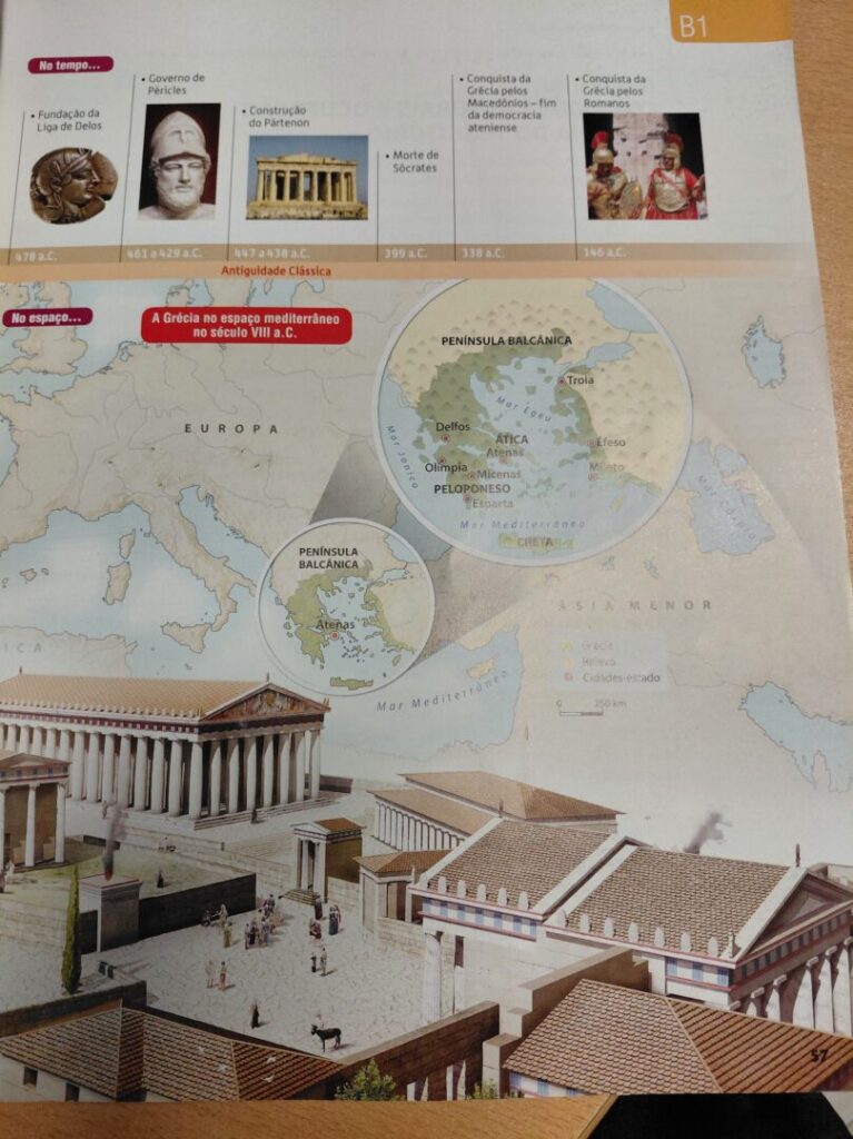 Povijest se počinje učiti u 2. ciklusu, ne kao samostalni predmet već je povezana s geografijom te se uče osobitosti Portugala. Od 7. razreda postaje zaseban predmet te se uči prapovijest, stari narodi, antička Grčka i Rim, a knjige su prilagođene uzrastu, izgledaju kao slikovnice, s kvizovima za ponavljanje, vrlo vizualne i s malo teksta. U 8. razredu uči se srednji vijek i renesansa, u 9. razredu 19. stoljeće i industrijska revolucija, a u višim razredima 20. stoljeće, svjetski ratovi i portugalska diktatura.  Nastavnica na satu koristi knjigu, pametnu ploču i digitalni udžbenik. Sat traje 50 minuta.