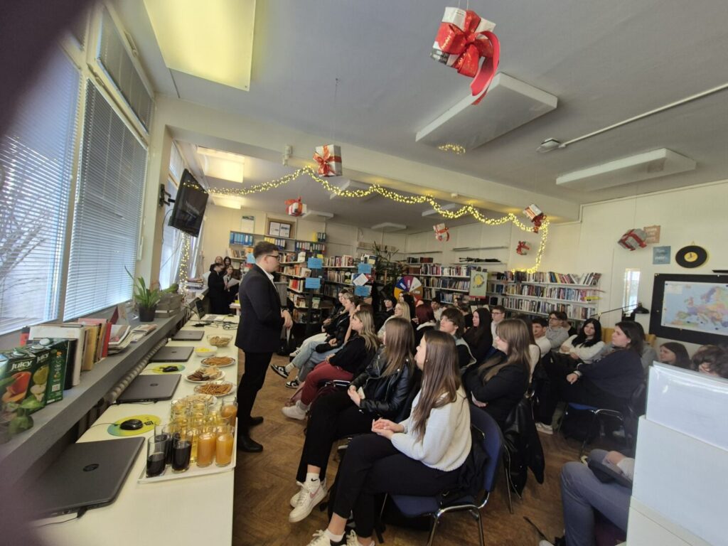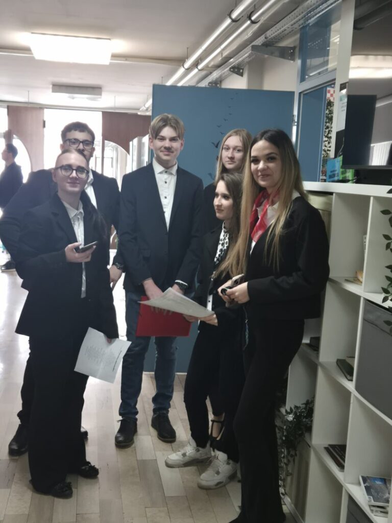 U sklopu obilježavanja Međunarodnoga dana materinskoga jezika (21. veljače) i Mjeseca hrvatskoga jezika, u našoj se školi u četvrtak 26. veljače 2026. održalo izlaganje brojnih učeničkih radova. Tako su učenici 1. h razreda (tehničar turističke destinacije) pod mentorstvom prof. Sanele Đurđević izlagali radove u sklopu projektne aktivnosti “Stihom i pričom do zadovoljnog gosta”: uredili su školski pano, čitali vlastite pjesme s tematikom poslovnoga bontona (Jan Milojević, Ivan Bortulić, Dora Vučak, Martina Balaško, Lorena Prečanica), čitali sastavak na temu “Moj hotel – komunikacija, atmosfera i odnos prema gostu” (Barbara Dautanec i Katrin Kemenović – intervju, Mihaela Kuček, Dora Vučak) te izložili prezentaciju o poslovnome odijevanju (Elena Rajkovača). Kako bi dočarali poslovnu atmosferu, odjenuli su se i sami u skladu s poslovnim bontonom.