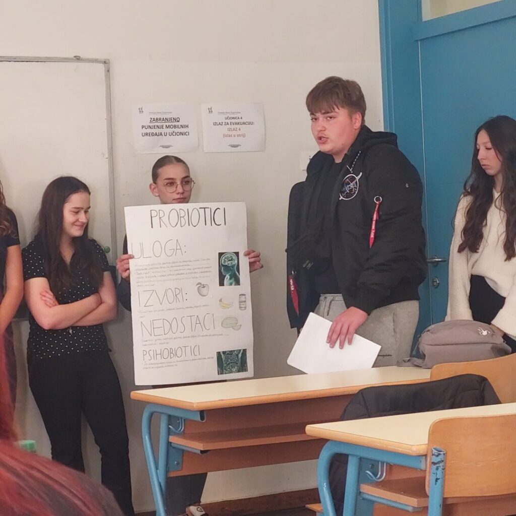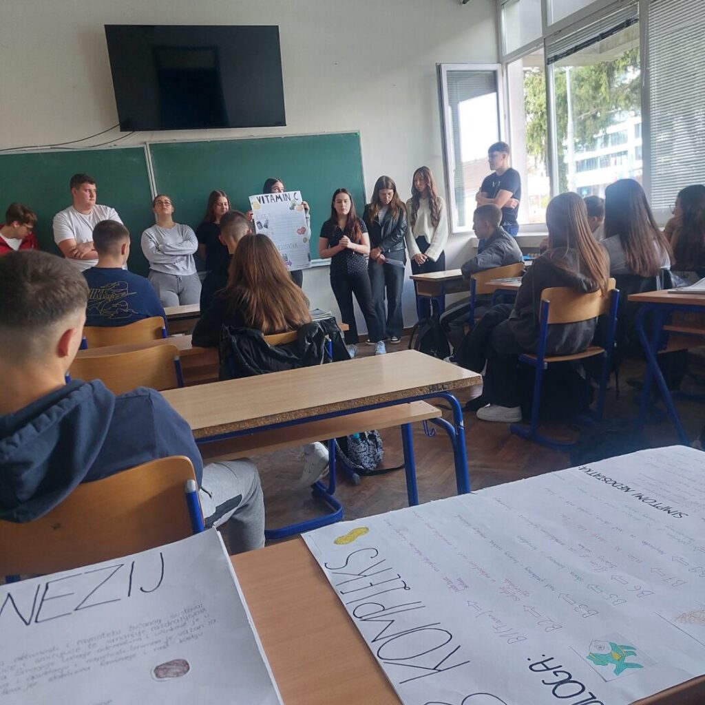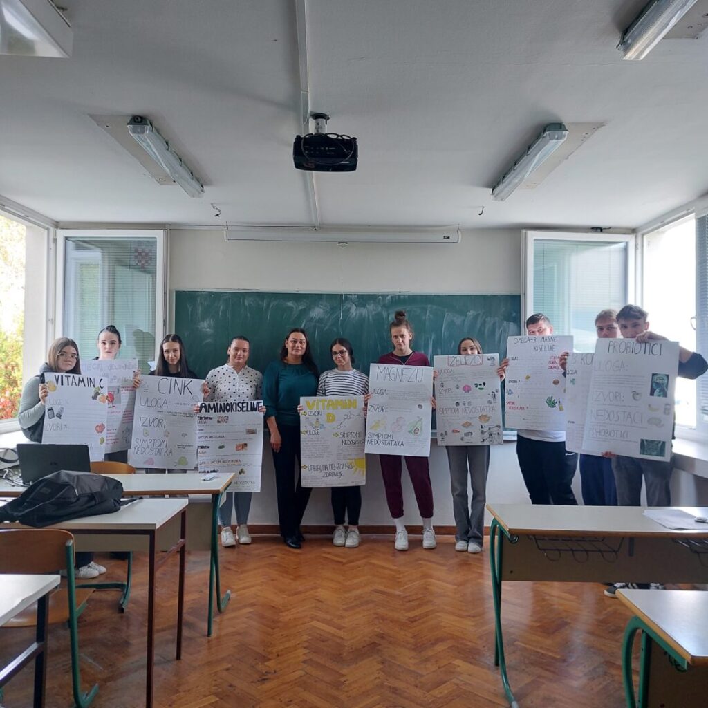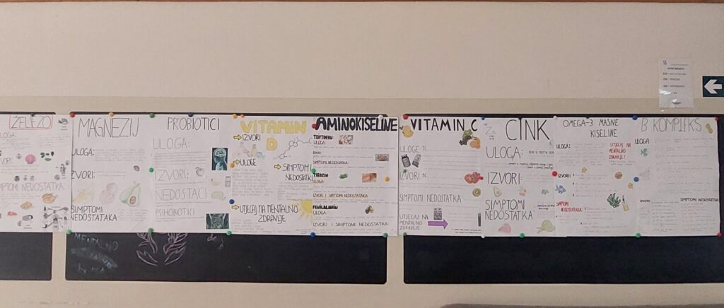 Učenici trećeg razreda, zanimanja medicinska sestra/ tehničar opće njege s nastavnicom Željkom Razman, prof. biologije i kemije od početka nastavne godine radili su na školskom projektu „Mikronutrijenti u službi dobrog mentalnog zdravlja“. Prvi dio zadataka u sklopu projekta bio je istražiti razne vitamine, mineralne tvari, aminokiseline, probiotike, esencijalne masne kiseline i njihov utjecaj na pravilno funkcioniranje te biokemiju živčanog sustava.