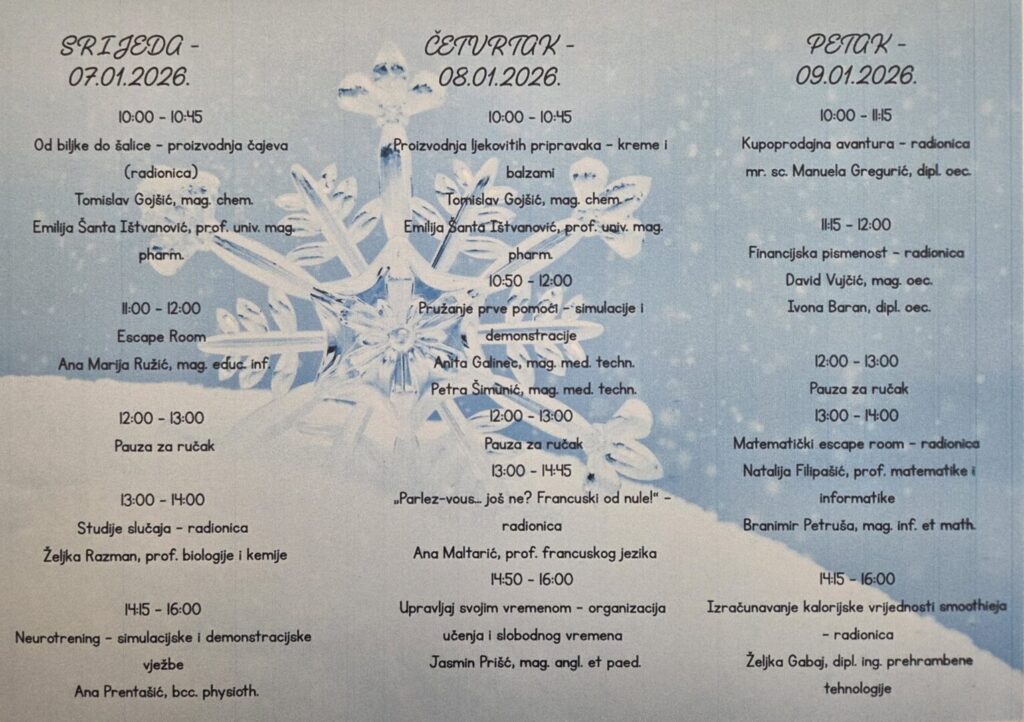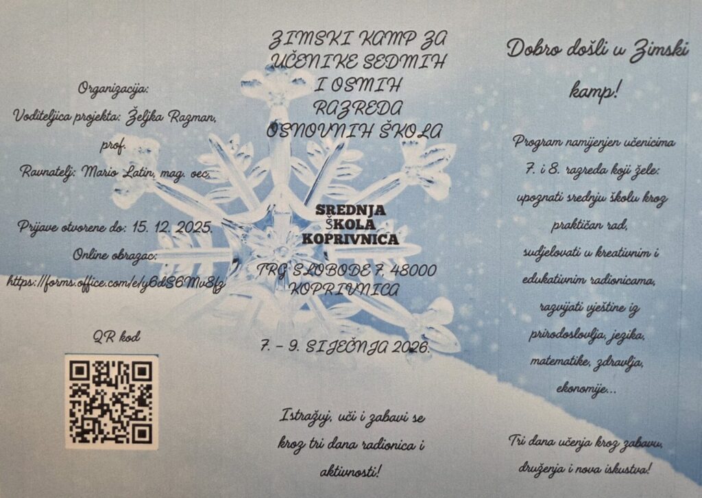Od 7. do 9. siječnja 2026. g. u školi će se održati Zimski kamp za učenike 7. i 8. razreda županijskih osnovnih škola. Namijenjen je zainteresiranim učenicima koji žele upoznati srednju školu kroz praktičan rad, sudjelovati u kreativnim i edukativnim radionicama, razvijati vještine iz prirodoslovlja, jezika, matematike, zdravlja, ekonomije.